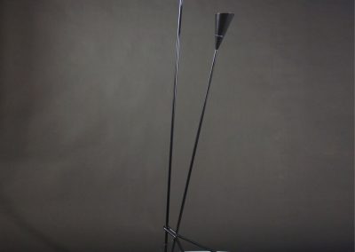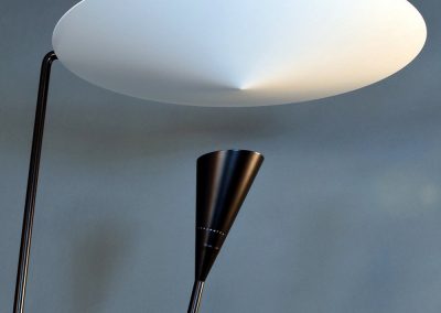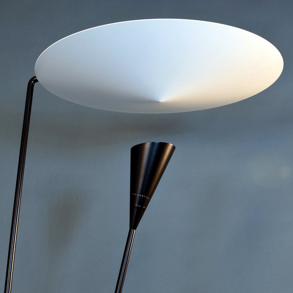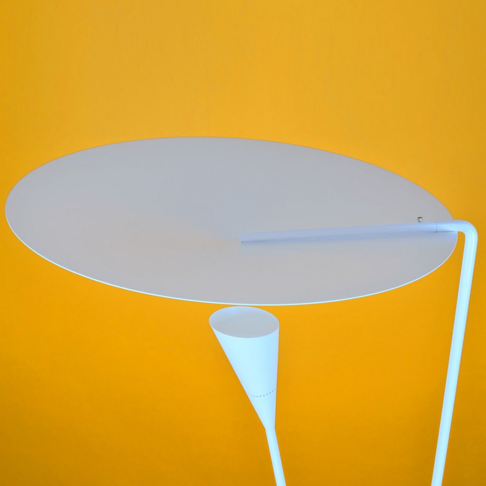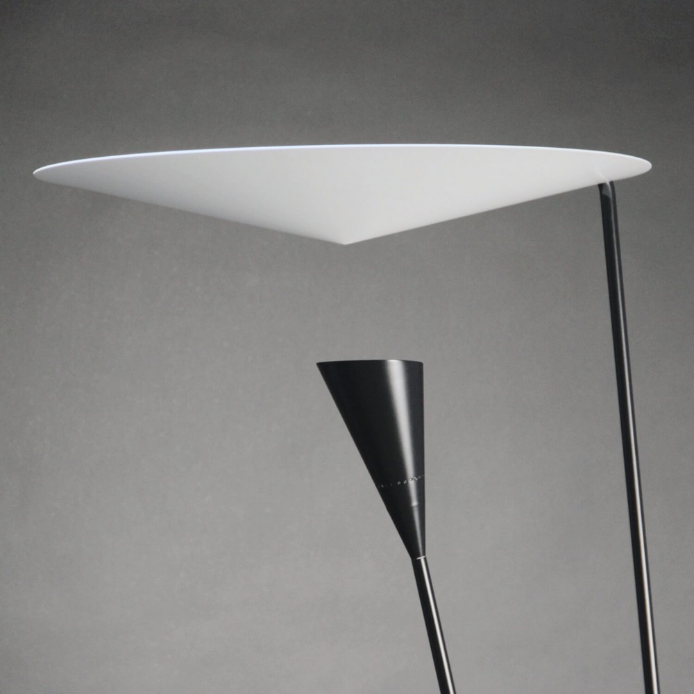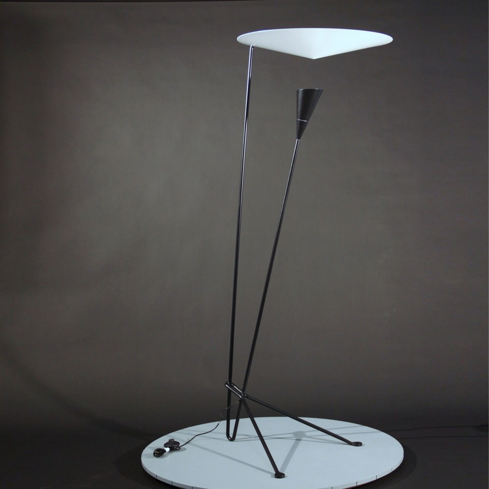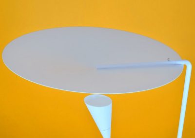 Dynamic lines and the innovative means by which the light is dispersed are signatures of this Michel Buffet Lamp. Light shines from the shade below to the conical disc above and is reflected out.