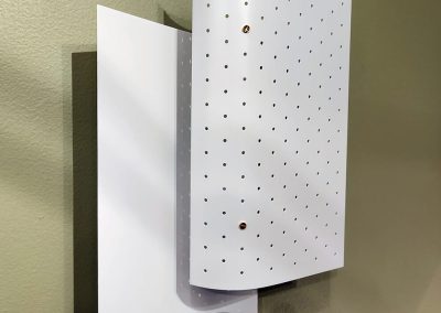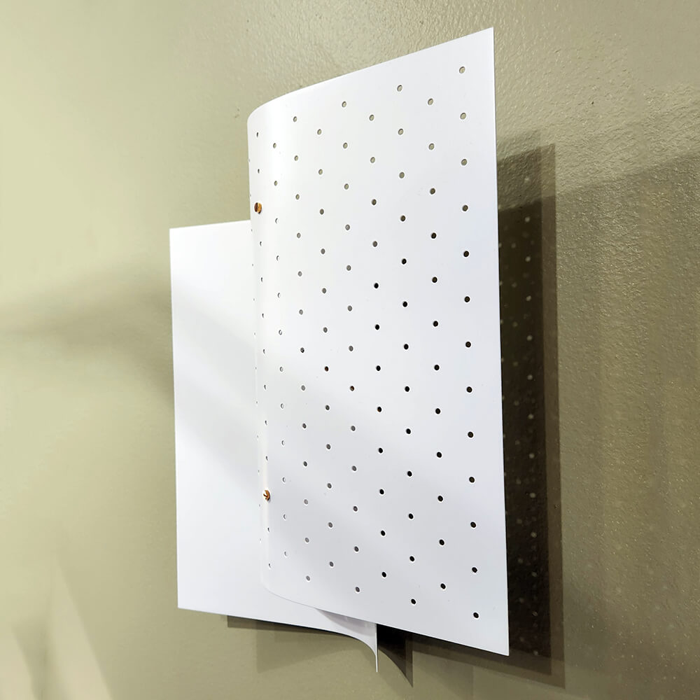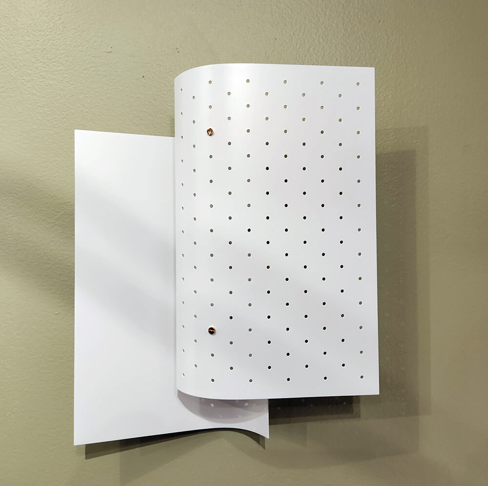 This lamp consists of 2 staggered layers of metal sheets. The light from the light bulb in between the 2 sheets is reflected against a solid steel sheet diffusing the light in the room while a perforated metal sheets in the front indirectly reflects the light against the back and filters the direct light to the front.
