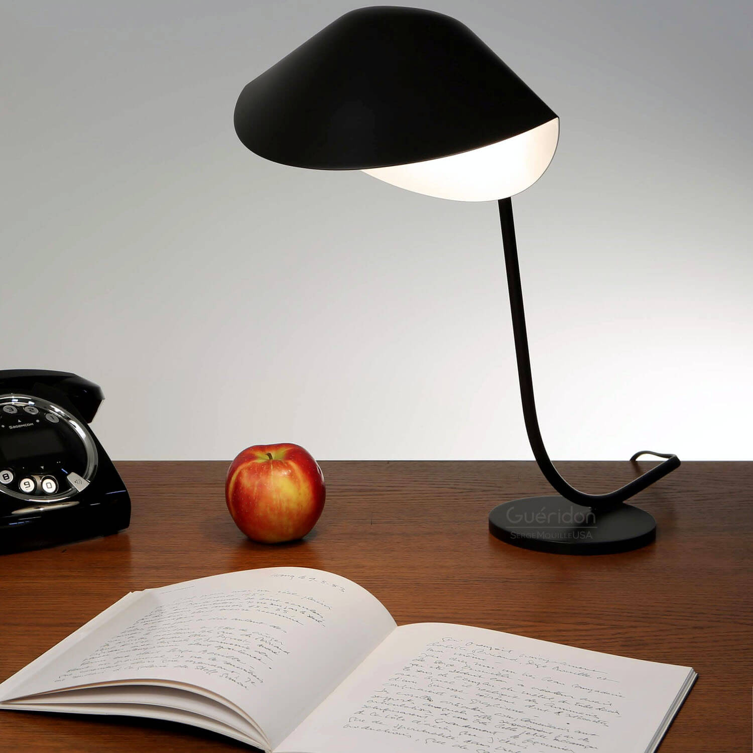 Unique for the Antony Desk lamp, Serge Mouille designed a sloping arm with an angled top attaching to the shade. All atop a round base.