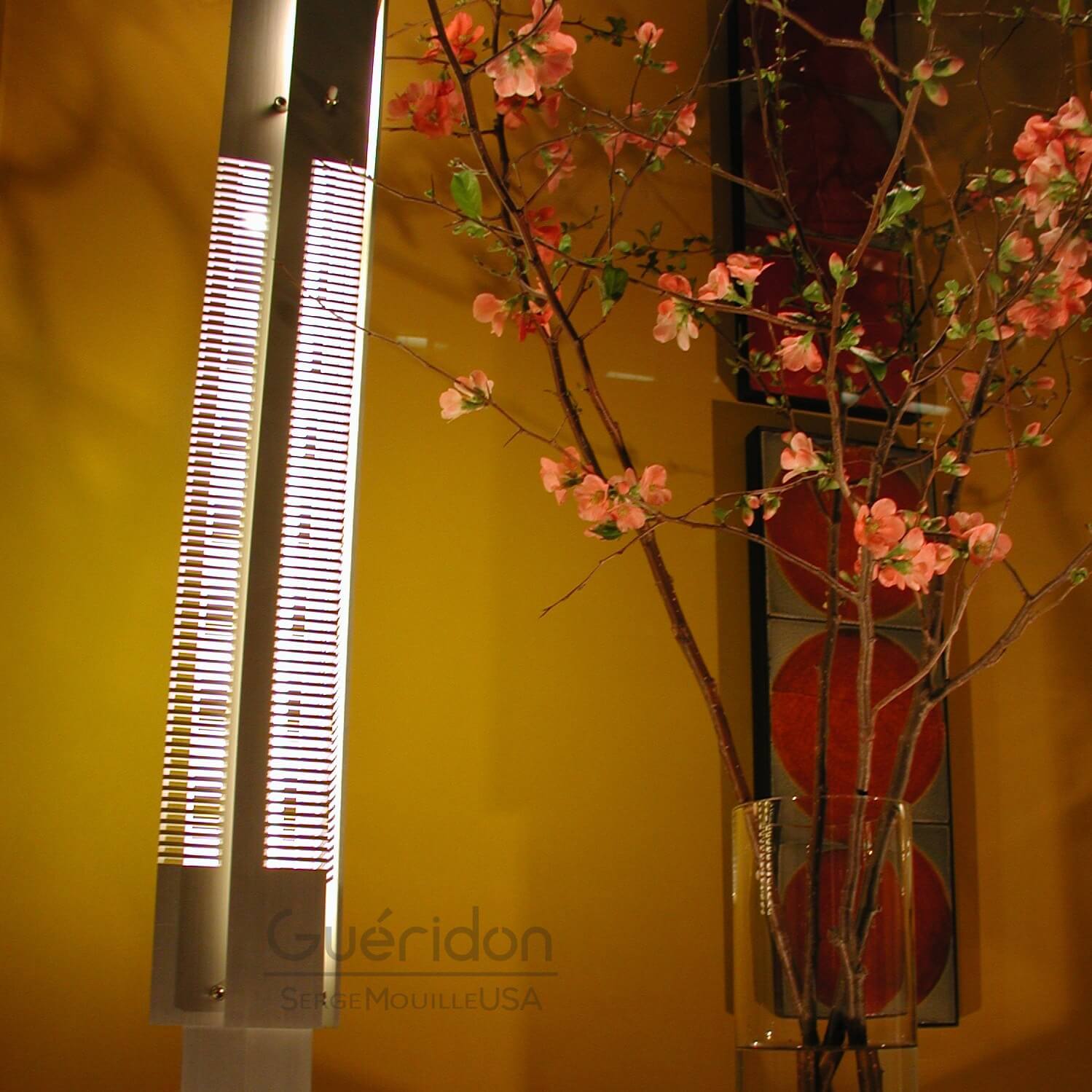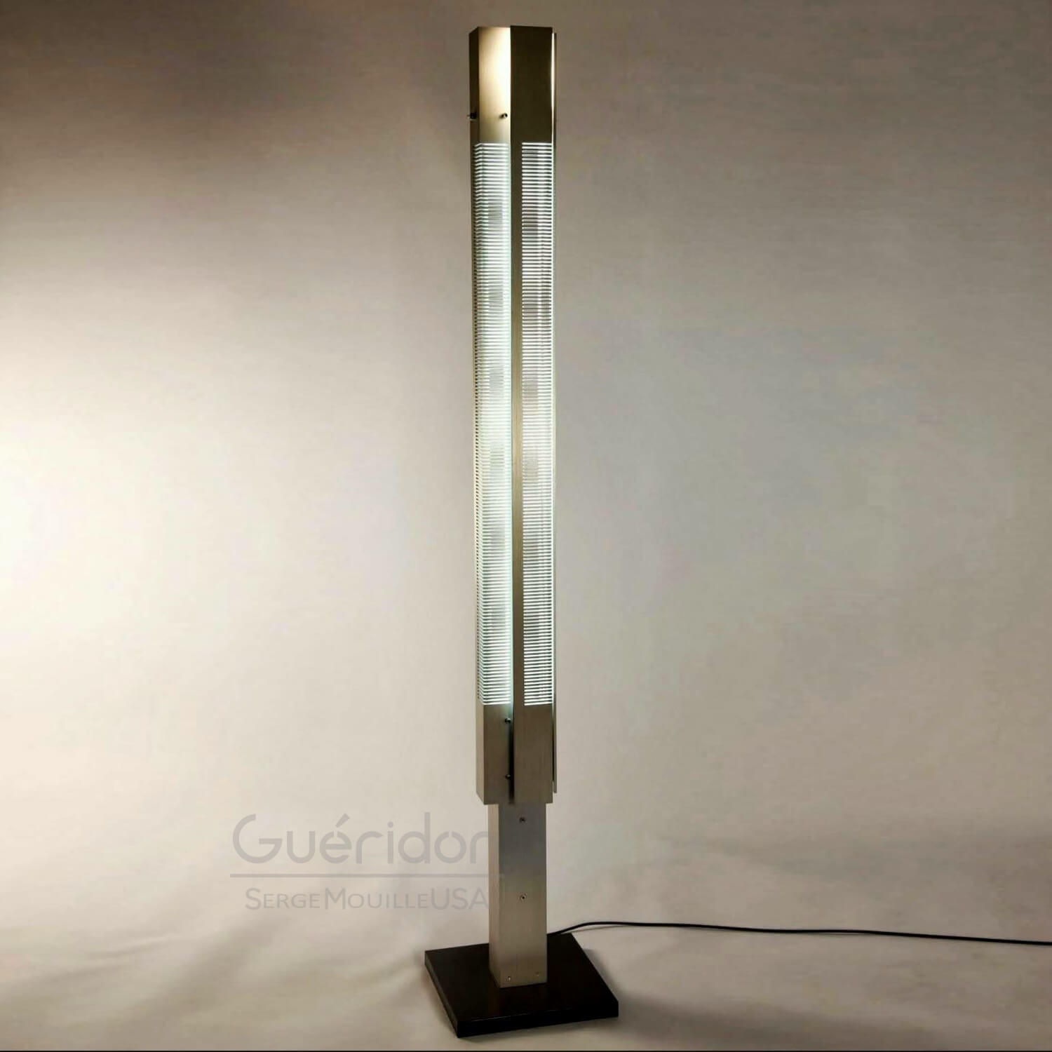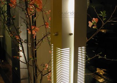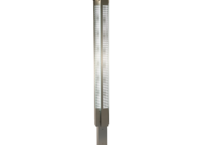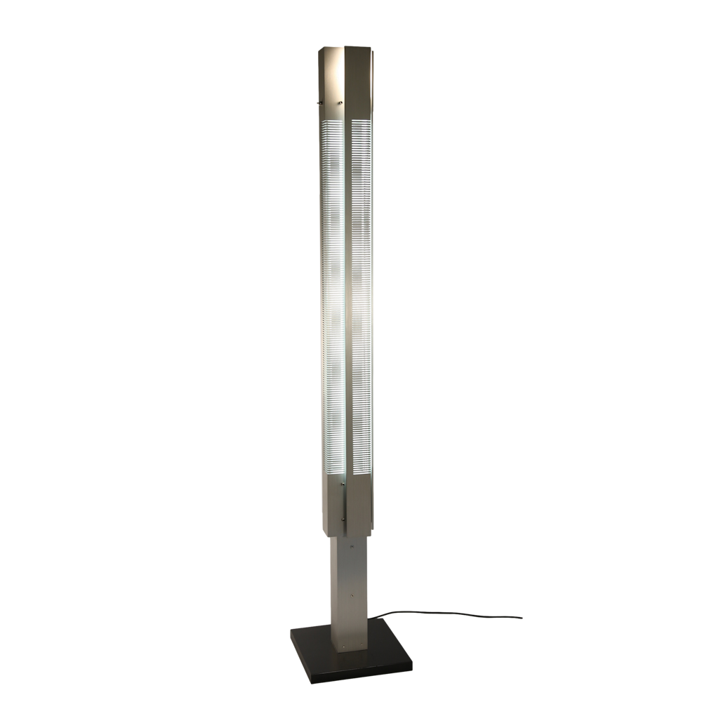 Steel pedestals featuring a combination of incandescent and fluorescent lighting. Each glows through rhythmical cuts in solid panes.