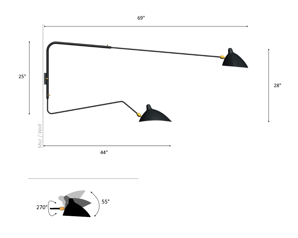 The long straight arm of this sconce is 69 inches allowing for illumination deeper into a room when needed while the shorter arm maintains lighting closer to the wall. Maximum Flexibility is achieved with independently rotating arms and swiveling heads.