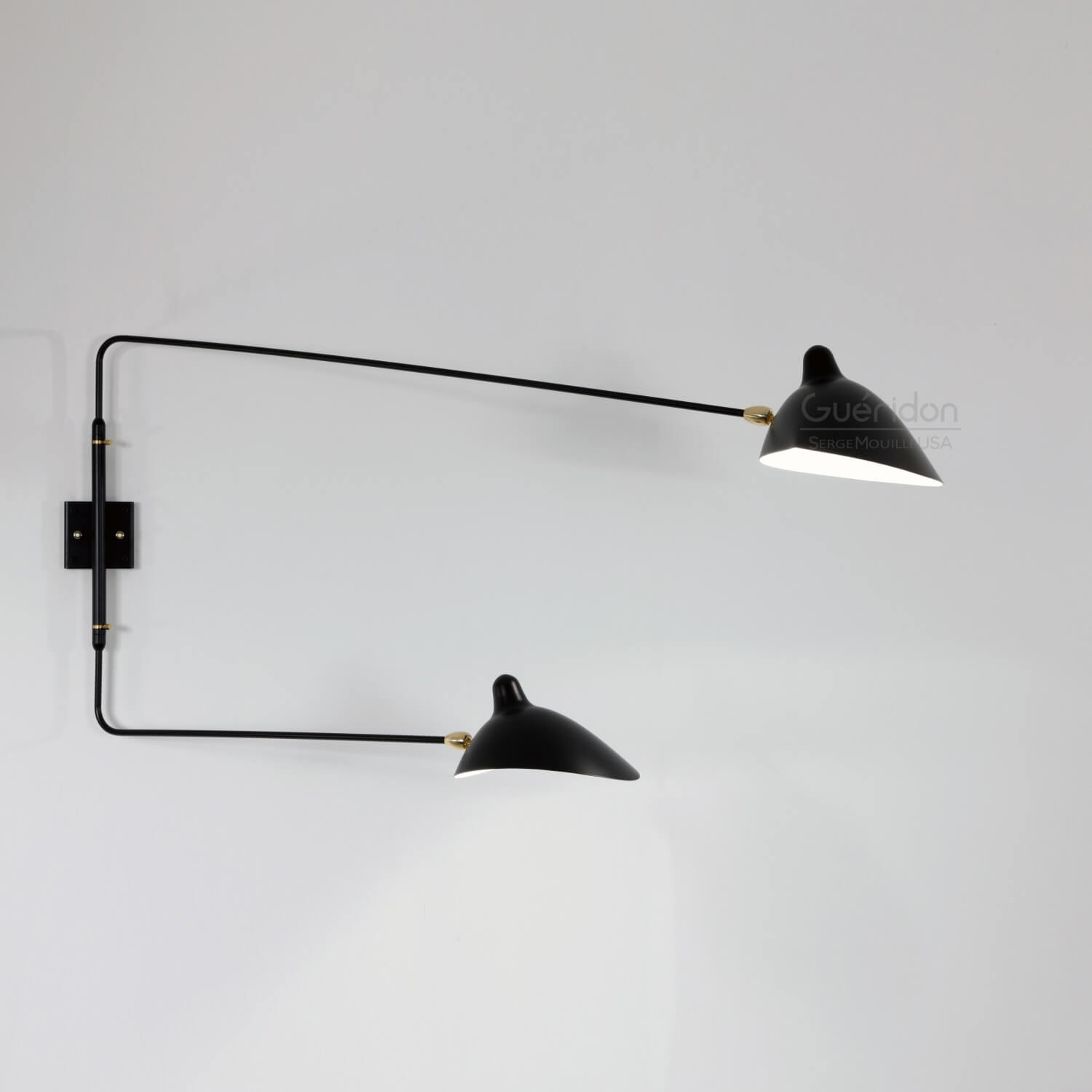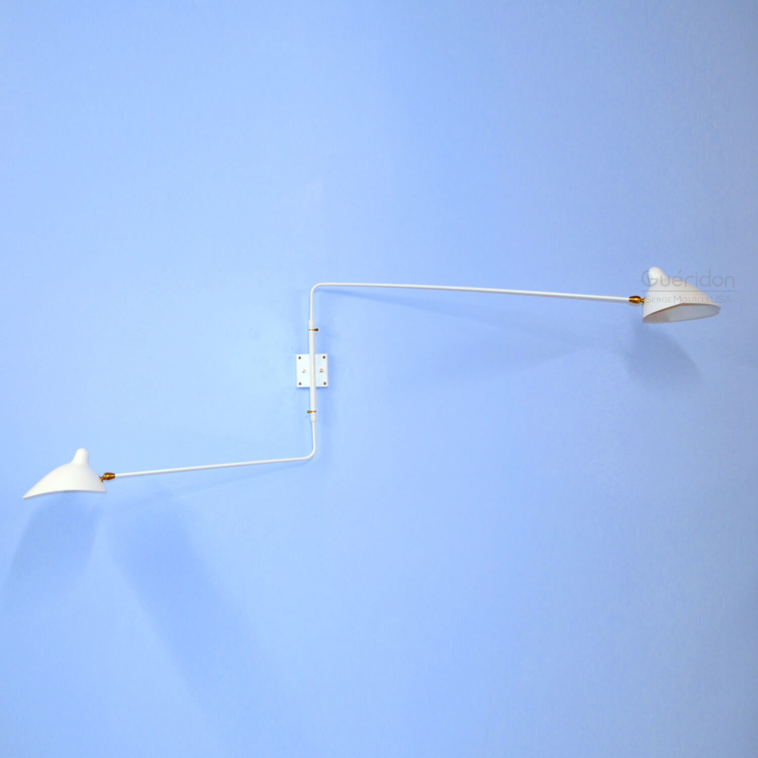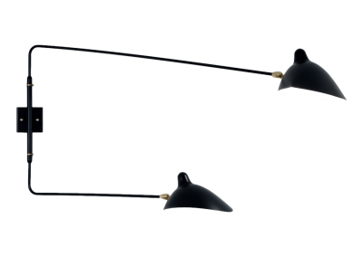 A practical lamp that is capable of illuminating two areas at the same time. The arms independently rotate while the shades tilt and revolve on their own accord. A dual switch on the mounting place allows for individual control of the lights.