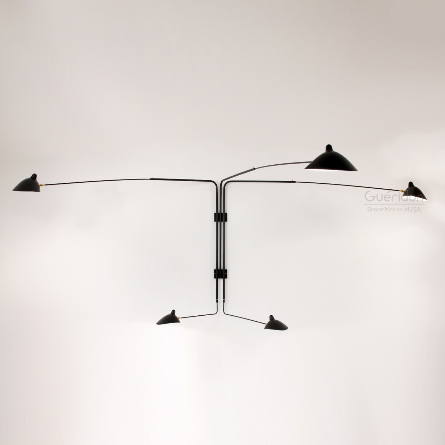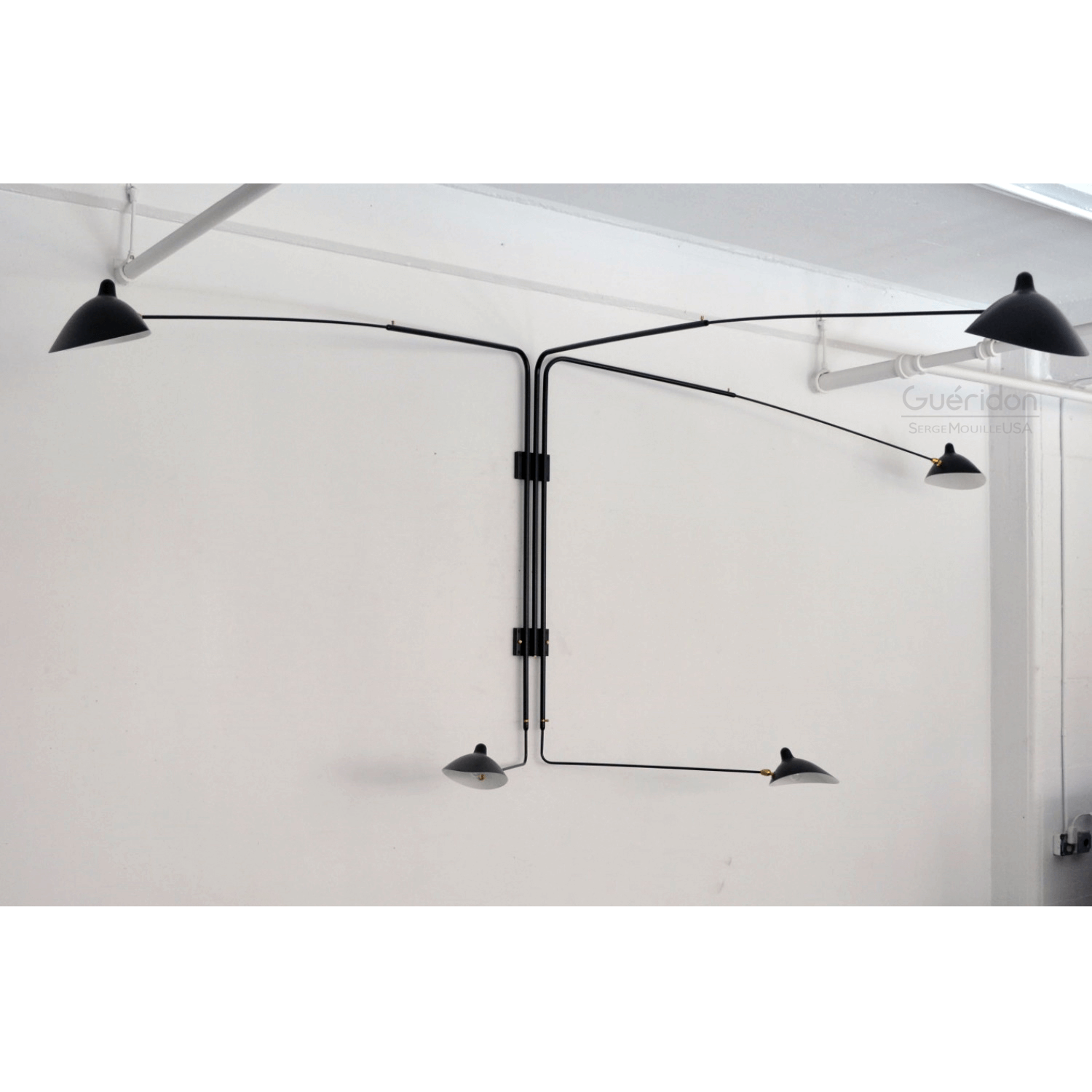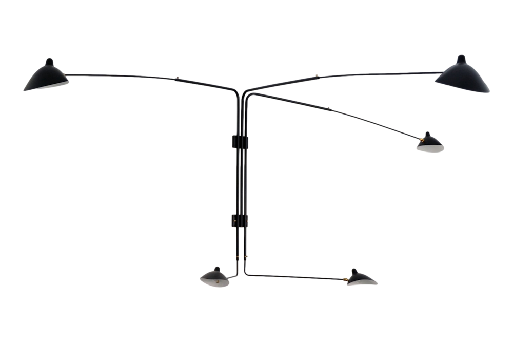 As with all Mouille sconces, the lamp heads both rotate and swivel. Available in black or white with brass fittings.